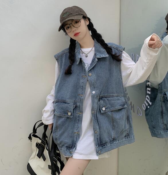 ジージャンデニムジャケットベストジャン青シンプルボタンポケットビッグ大きいサイズダンス衣装ヒップホップレディースガールズ大人ストリートアウタージャンパー韓国