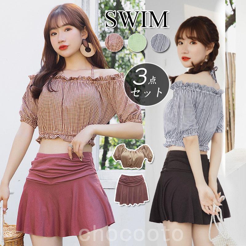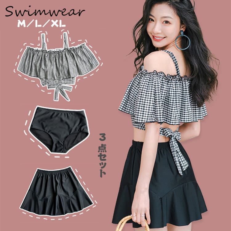 水着 レディース バンドゥ ビキニ キャミソール チェック柄スカート 体型カバー 中学生 高校生 女の子 オフショルダー ハイウエスト ママ水着