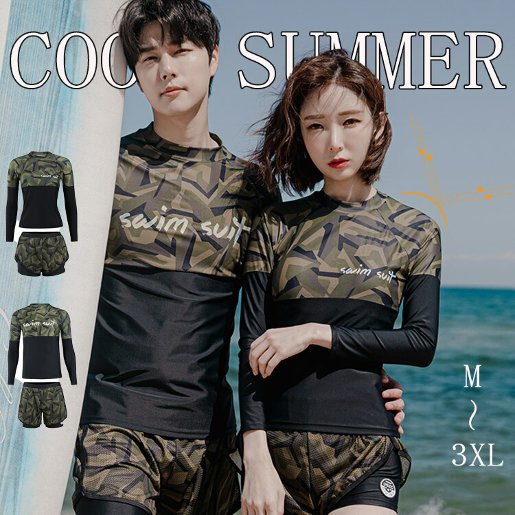 水着 カップル ミズギ 男女 温泉 お揃い 男性用 サーフパンツ 水着 大人 レディース 体型カバー 潜水服 エレガント セパレート ママ水着 露出控えめ 水着 2点セット 日焼け止め 迷彩柄
