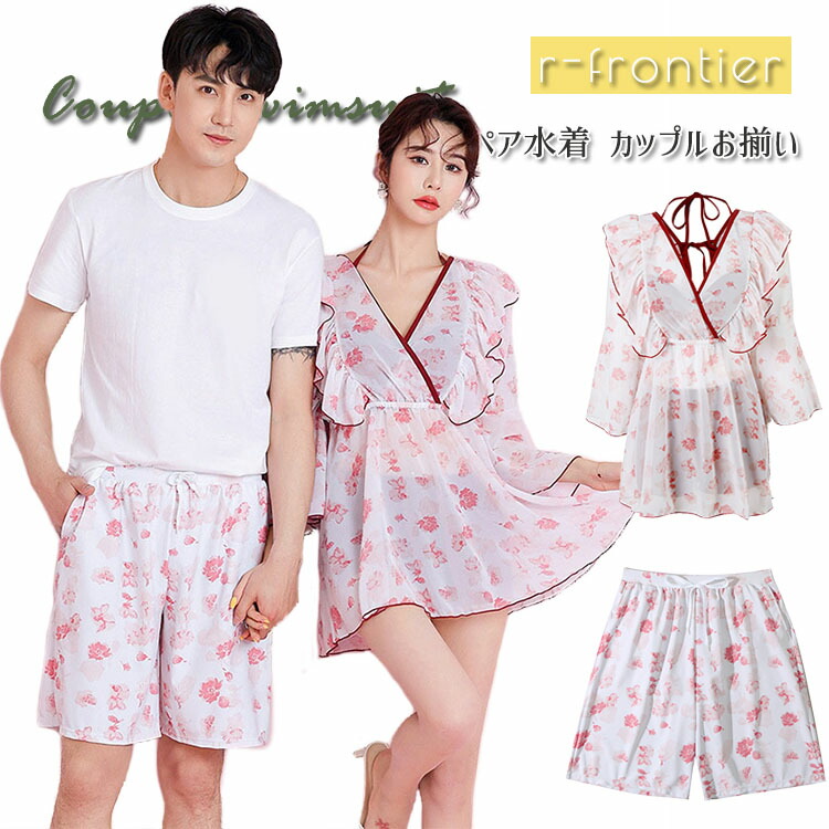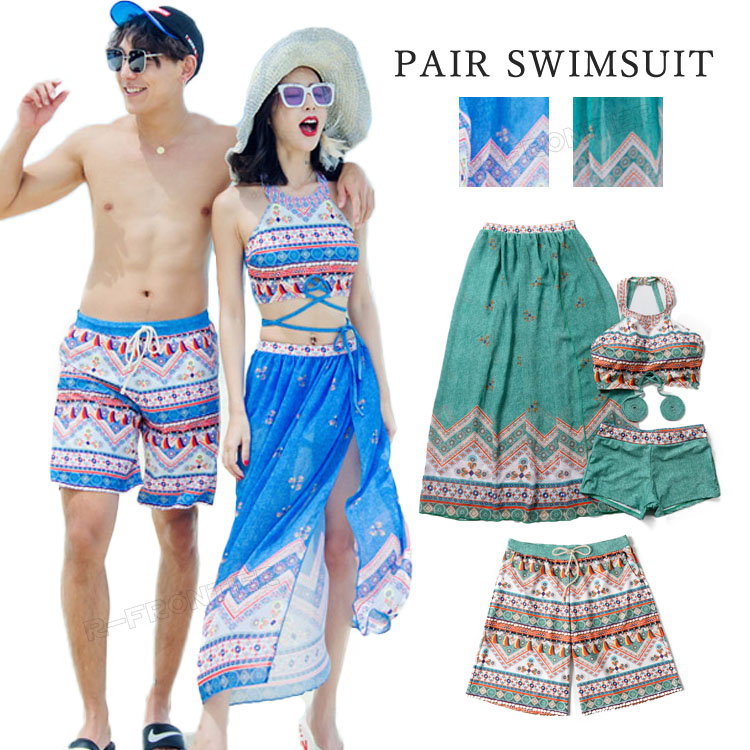 ペア水着 カップル パレオ付き 日よけ 体型カバー レディース 花柄 カップル ペアルック セパレート ビキニ タンキニ ハーフパンツ メンズ用 3点セット 温泉 プール 海遊び ビーチ 韓国風