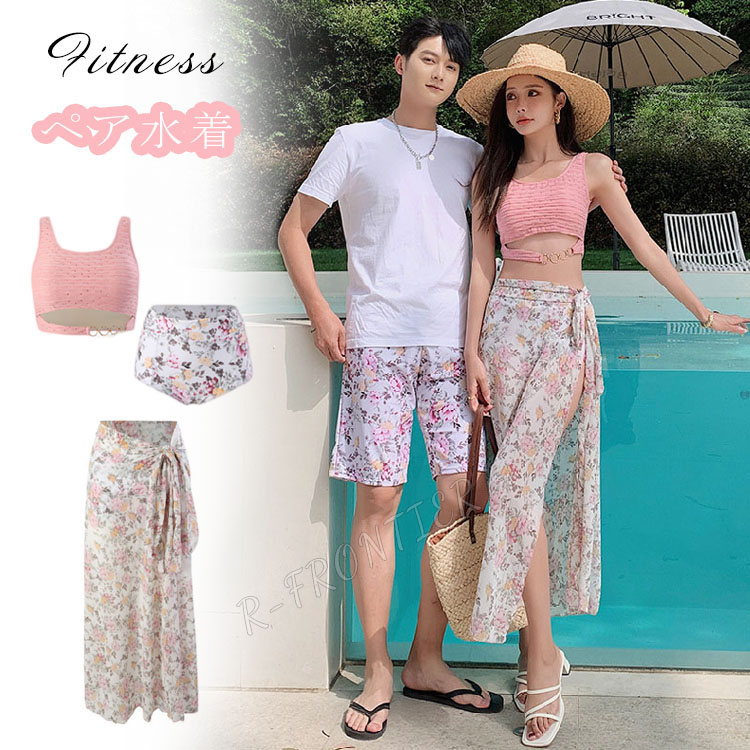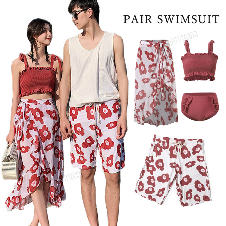 ペア 水着 カップル パレオ付き レディース ビキニ 韓国 カップル 夫婦 男性 ビーチパンツ ペアルック 3点セット セパレート セットアップ 体型カバー ハーフパンツ セクシー 大人 花柄