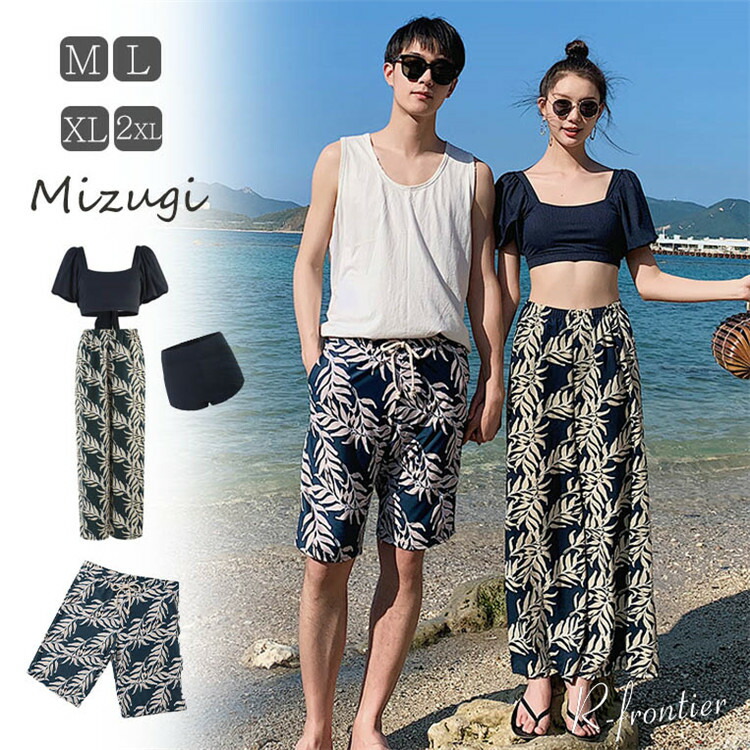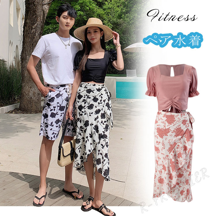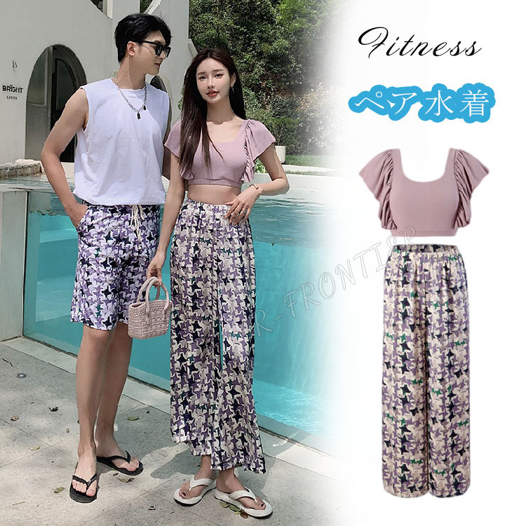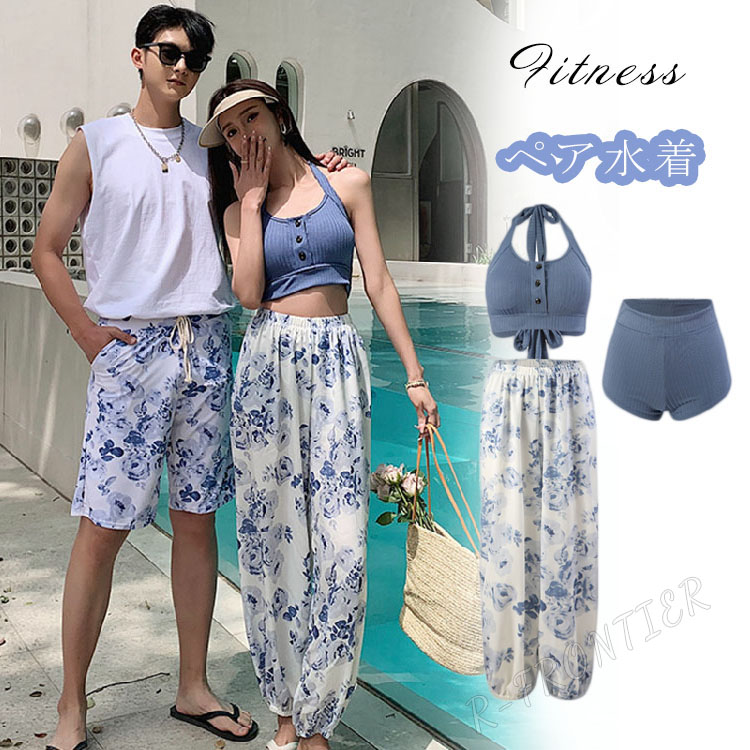カップル 水着 ペア ビキニ レディース 体型カバー ワイドパンツ セパレート カップル ペアルック 夫婦 韓国 3点セット セットアップ 体型カバー ハーフパンツ セクシー 大人 花柄