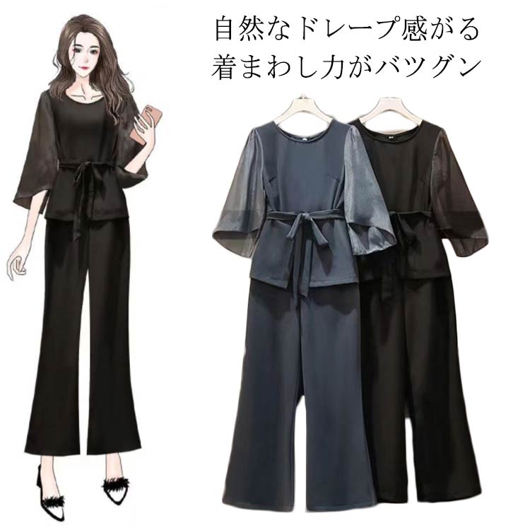 パンツスーツ セットアップ レディース シフォン パンツドレス 2点セット ワイドパンツ パーティードレス パンツ ブラウス シャツ フォーマル 春 夏 半袖 大きいサイズ スーツ オフィス 通