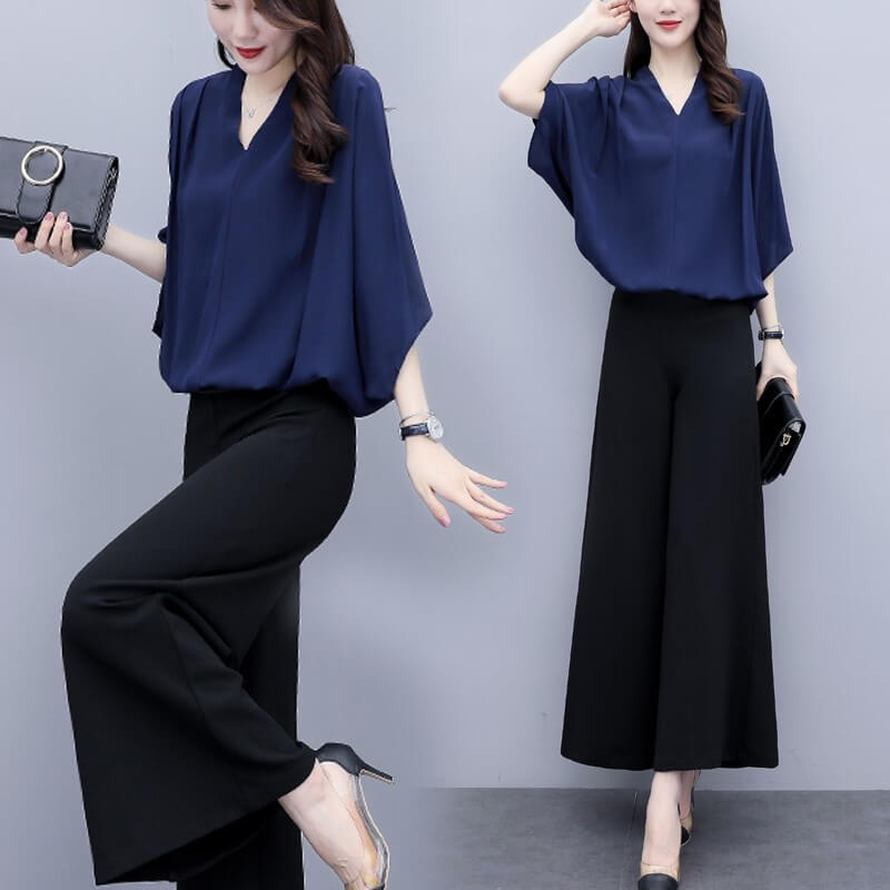 セットアップ レディース 春夏 オシャレセットアップ 半袖ブラウス 九分丈ワイドパンツ シフォン上下セット 韓国風 通勤OL 30代40代
