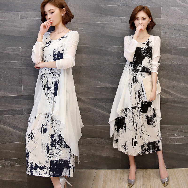 二点セット レディース 春夏 シャツ キャミソール アウター ロングワンピース ホワイト セットアップ シフォンワンピース 切り替え 七分袖 フォーマル