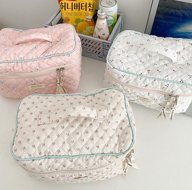キルティングポーチ3色化粧ポーチトラベルポーチ大容量洗面用具大きいおしゃれかわいい韓国旅行小物入れ収納化粧品メイクポーチ持ち手四角メイクボックスバニティー大きめ花柄さくらんぼチェリーリボン柔らかい綿