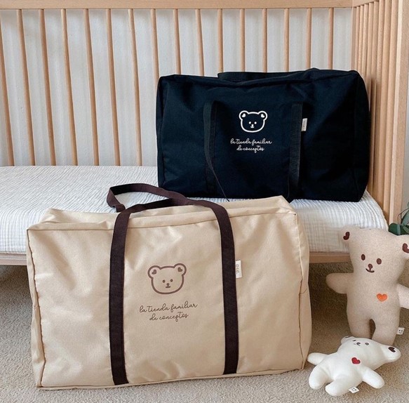 くまロゴマザーズバッグボストンバッグ旅行ベージュ黒ブラックトートバッグベアおしゃれかわいい韓国雑貨コットン綿大きい大容量ジップ付きファスナー付きママバッグバッグ鞄レディースナチュラルおむつ着替えミルク