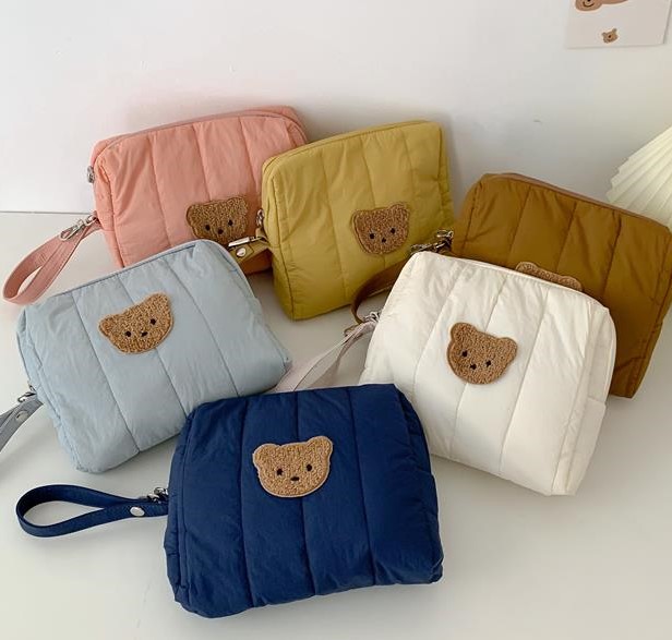 くまマルチポーチ韓国雑貨北欧赤ちゃんベビーグッズおむつポーチ刺繍ミルク化粧おしゃれかわいいトラベルポーチママ大容量 綿マザーズバッグメイク旅行化粧ポーチミニ白ホワイトブラウンブルーベアコットン綿