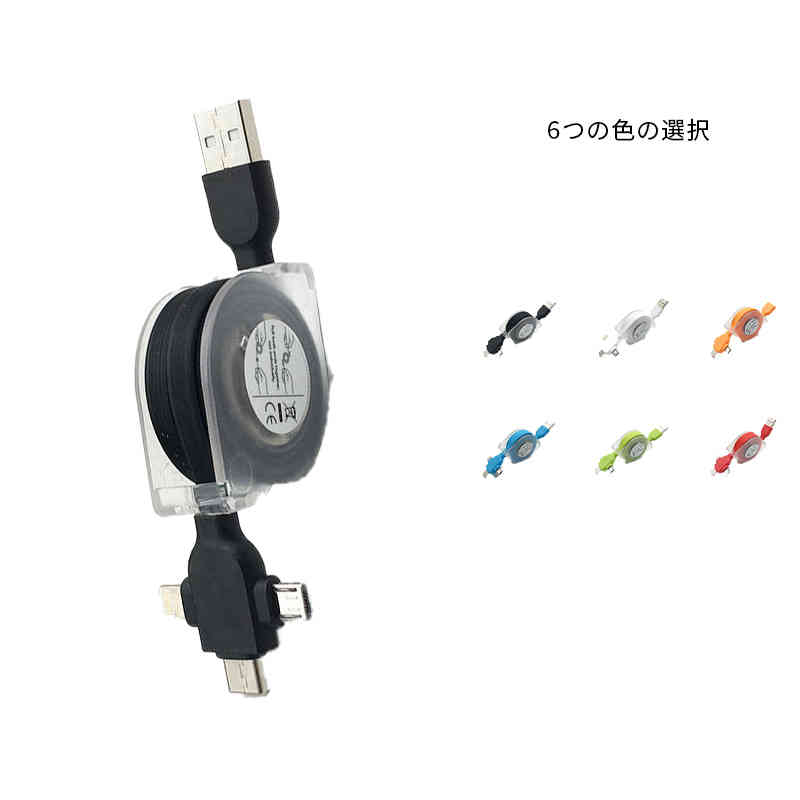 巻き取り式USBケーブル 急速充電 データ転送 巻き取り式 充電ケーブル 急速充電ケーブル 1本で3役 スマホ充電ケーブル