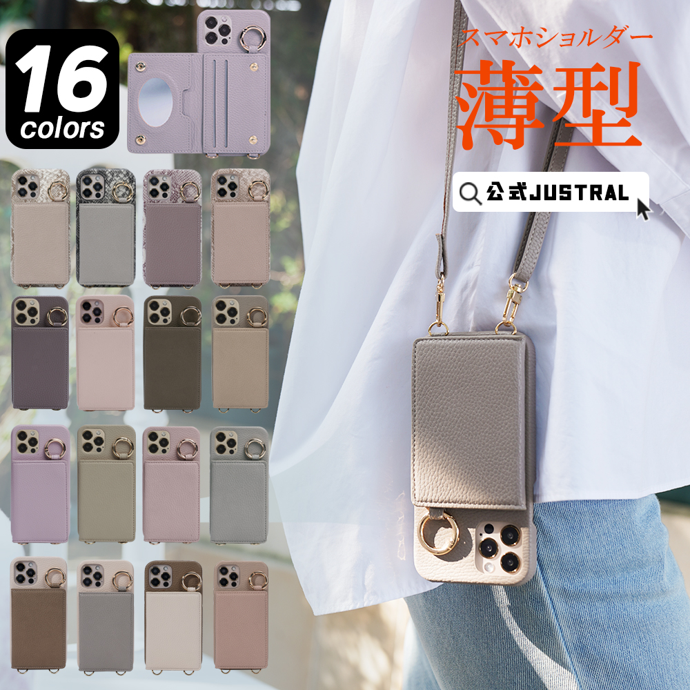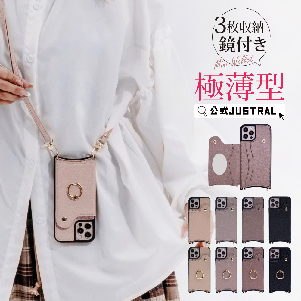 公式JUSTRAL ミラー付き カードホルダー 斜めかけ 肩掛け 背面手帳型ケース ストラップ付き スタンド アイフォン ストラップ付 肩掛け 鏡 iphone6 7 8 XR X XS カード収納