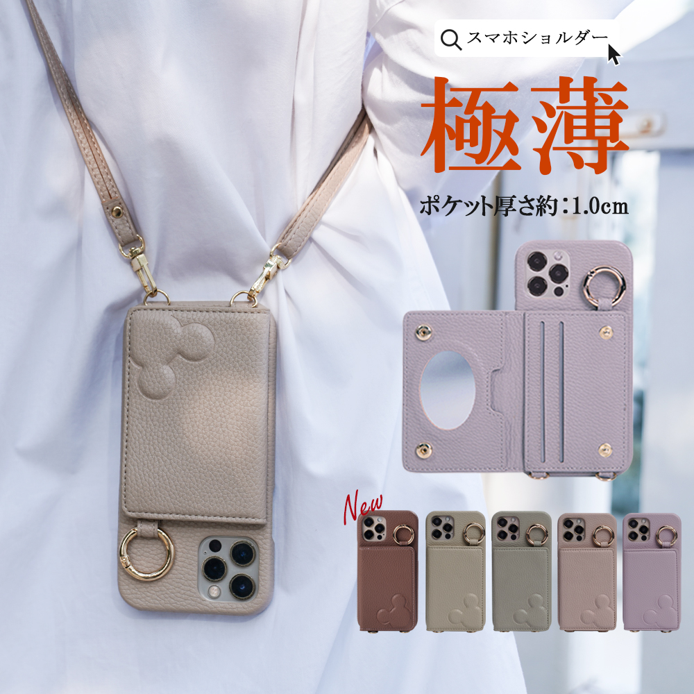 15 ミラー付き すまほけーす ショルダーブランド 丈夫 リング付き かわいい カード入れ 鏡付き くすみピンク カード収納