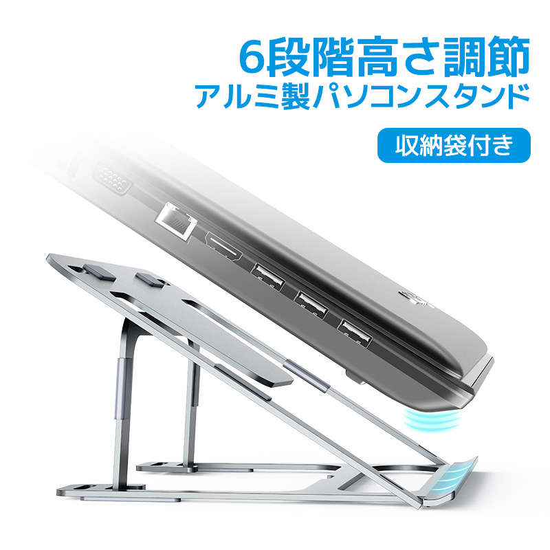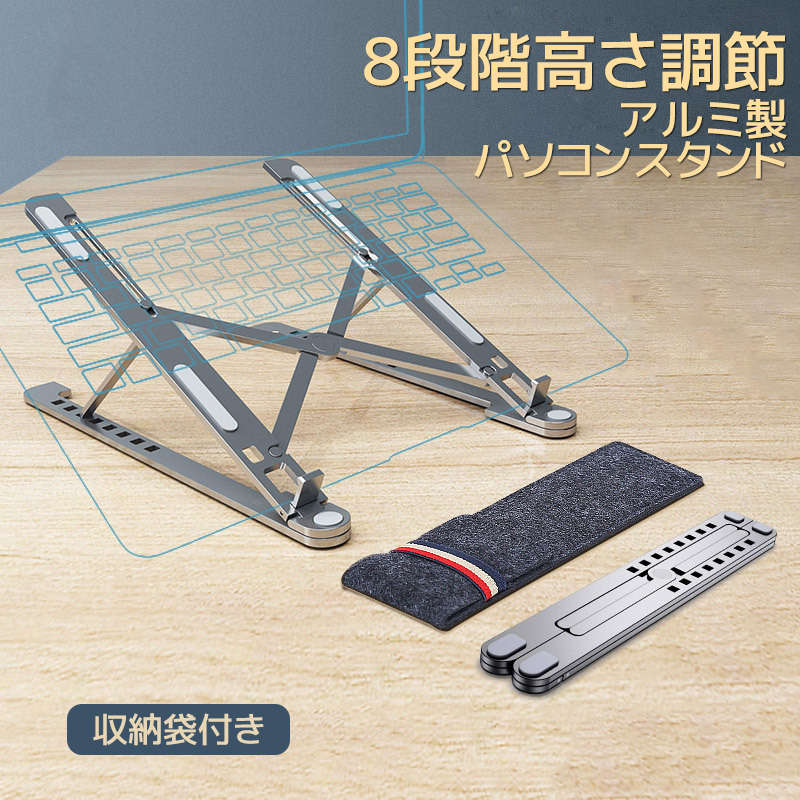 パソコンスタンド 収納袋付き スタンド アルミニウム ノートパソコン タブレット スタンド 角度調節 ノートスタンド ノートブック アルミスタンド タブレットホルダー 卓上スタンド 携帯 持ち