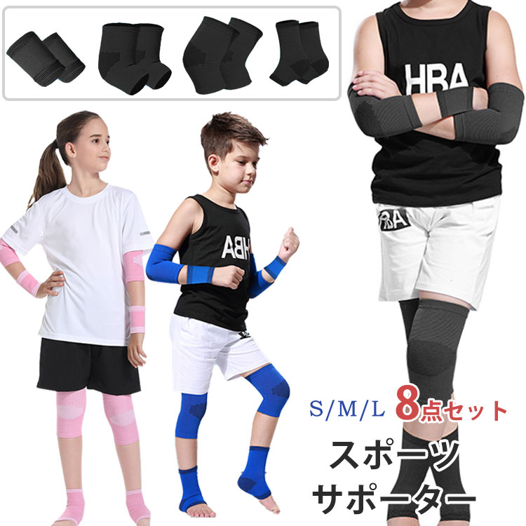 スポーツサポーター 膝サポーター 8点セット キッズ ジュニア 子供用 プロテクター 足首 手首 肘 膝パット ひざ ストレッチ 膝痛 関節痛 怪我防止 固定 通気性 吸汗性 膝当て アウトドア バレ