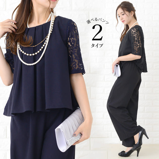 パーティードレス パンツドレス 選べる2タイプ ワイドパンツ テーパードパンツ セットアップ 上下セット 5分袖 花柄レース レディース フォーマル 上品 お呼ばれ 結婚式 入園式 入学式 大きいサイ
