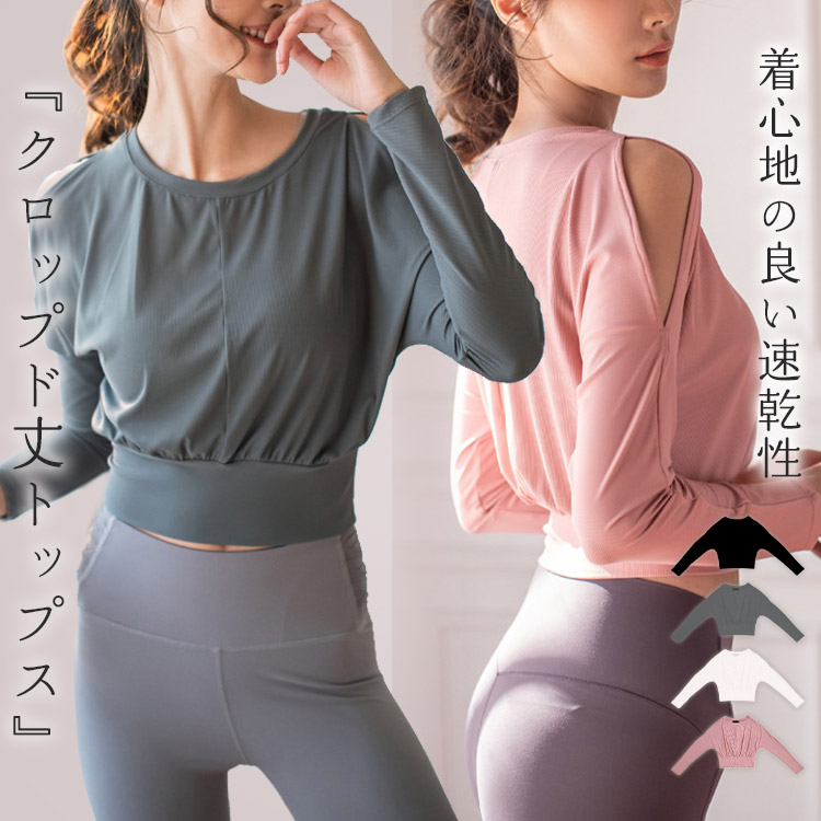 ヨガトップス 女性 プルオーバー 長そで 丈短め カットアウト オープンショルダー スポーツウェア ホワイト ブラック