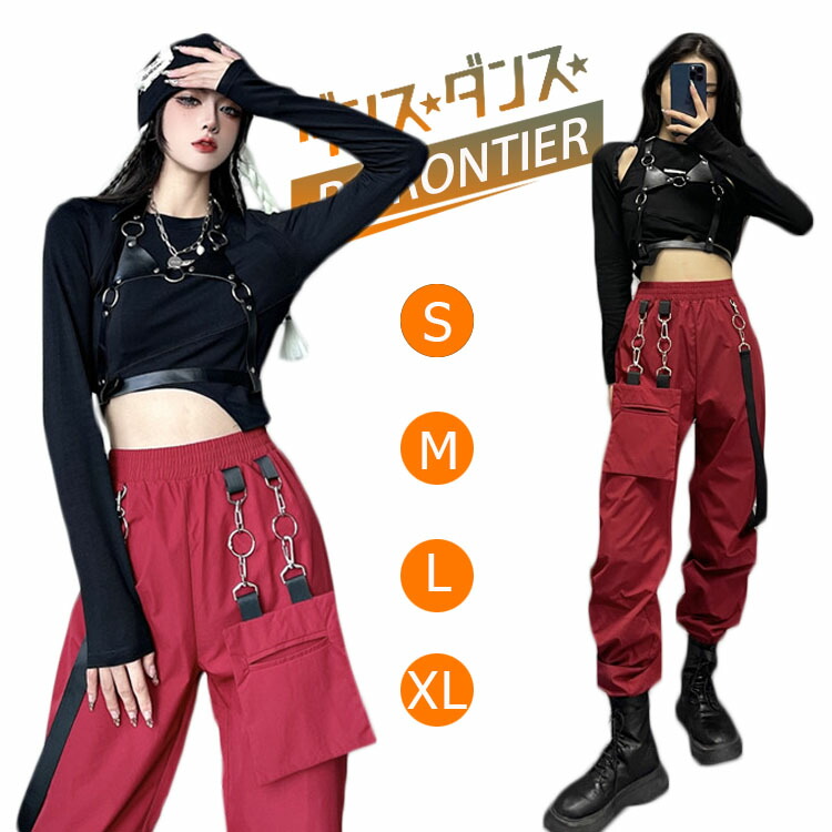 ダンス パンツ 赤 -衣装 大人 セットアップ レディース ヒップホップ 長袖 韓国 高校生 へそ出し トップス ジャズダンス ワイドパンツ ダンスウェア 練習着 舞台用 カーゴパンツ