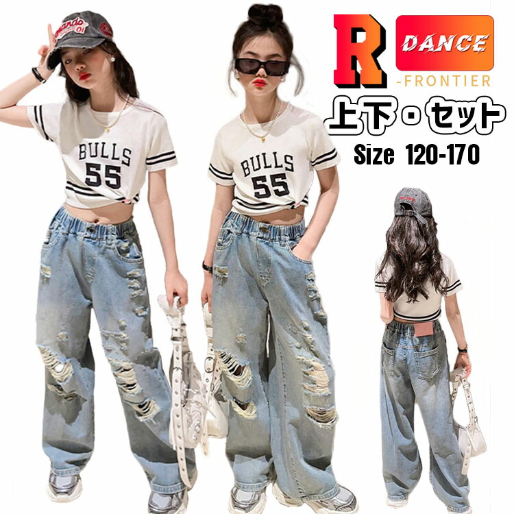 キッズ ダンス 衣装 セットアップ へそ出し 白トップス デニムパンツ ダメージパンツ k-pop HIPHOP ジャズダンス ヒップホップ 120 130 140 150 160 170