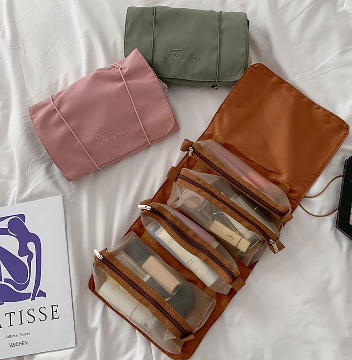 トラベルポーチ3色大容量洗面用具吊り下げ化粧ポーチ大きいシンプルオレンジブラウングリーン緑ピンクおしゃれかわいい韓国旅行ケース小物入れ収納化粧品メイクメッシュ取り外しポーチ取り外しマットカラー
