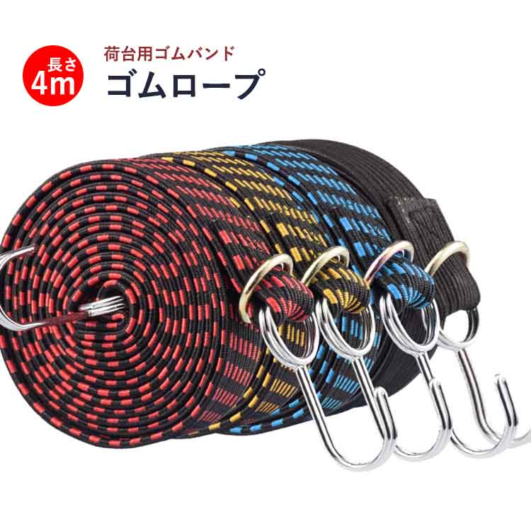 ゴムロープ フック付き 4m 荷台用ゴムバンド ゴムひも 固定バンド 荷締めベルト 伸縮性 高強度 キャリーベルト 荷物固定ベルト 自転車 荷台 バイク 全4色