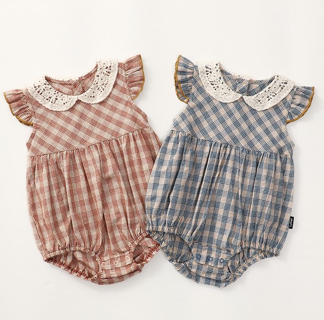 チェック半袖ロンパースベビー服赤ちゃん女の子ボタンカバーオールコットン可愛いおしゃれ韓国ナチュラル60~110春夏綿ベビーおしゃれお出かけ赤レッドピンク青ブルーレースフリルレトロ襟ギンガムチェ