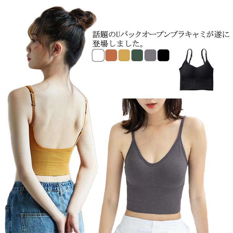 Uバック バックオープン ブラトップ ショート丈 キャミソール ノーマル Vネック カップ付きインナー ブラキャミ リブ 背中開き ルームウェア フィットネス スポーツウエア