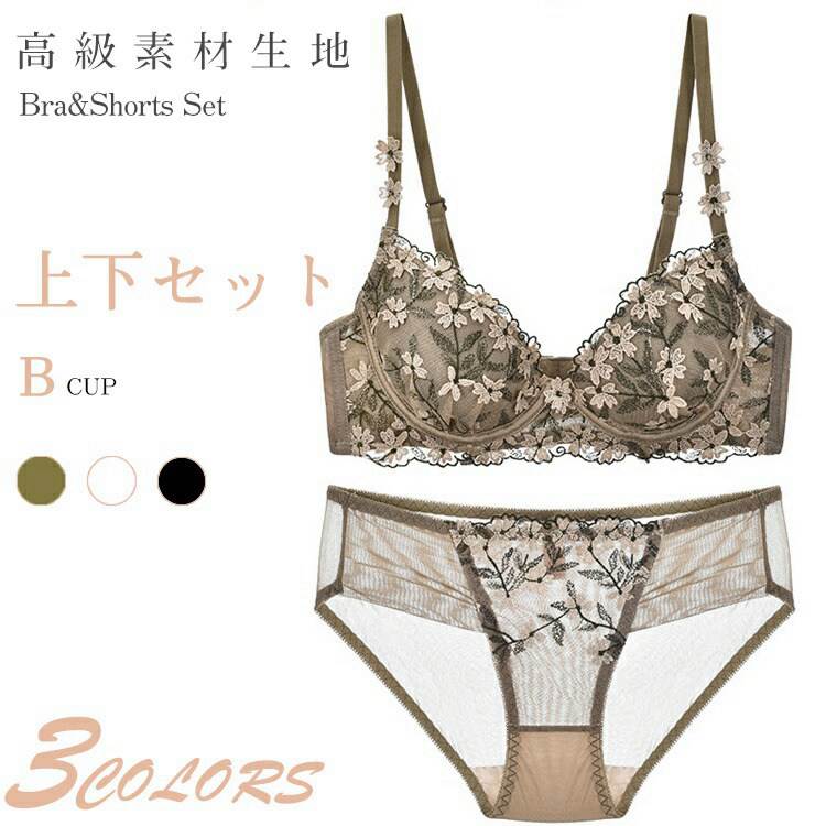 下着セット レディース ノンワイヤーレースブラ 花柄刺しゅうランジェリーセット 透け透け セクシー ショーツ フェミニン
