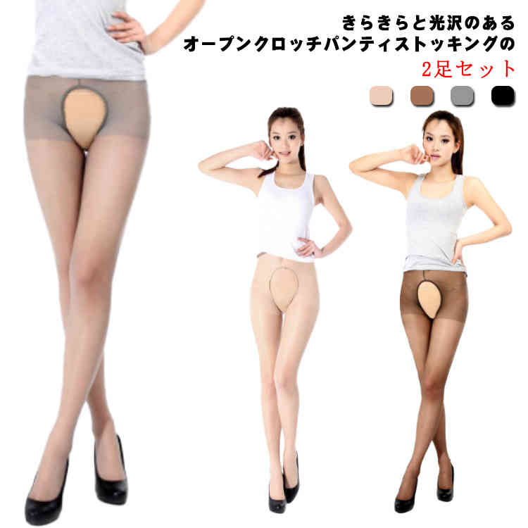 2足セット オールスルー 光沢 オープンクロッチ 穴あき ストッキング クロッチオープンストッキング 2足セット ブラック グレート 肌色