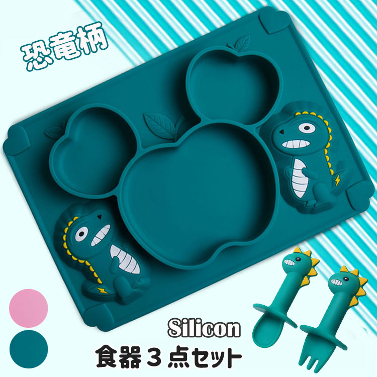 恐竜柄 ベビー食器 お食事プレート 可愛い 離乳食プレート 食器セット 3点セット ひっくり返らない 吸盤付き 女の子 男の子 シリコン ギフト プレゼント お出かけ 赤ちゃん 子供 お皿 フォーク