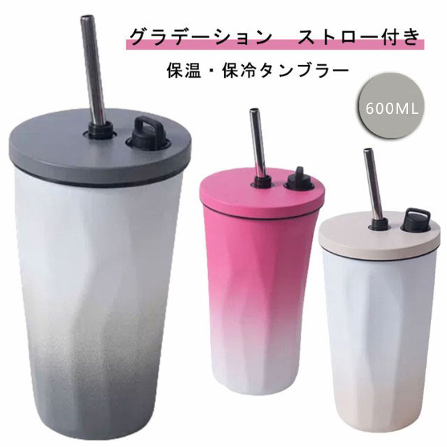 タンブラー 水筒 600ml マグ ステンレス コーヒーカップ 蓋付き ストロー付き おしゃれ グラデーション タンブラー 二重構造 アウトドア 遠足 車 キャンプ