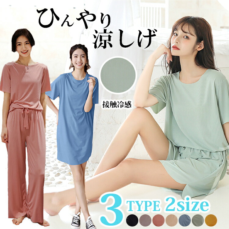 3タイプ 2サイズ フリーサイズ 大きいサイズ 接触冷感パジャマ レディース 半袖 ハーフパンツ 長ズボン ワンピース ルームウェア ナイトウェア カットソー 上下セット ゆったり かわいい