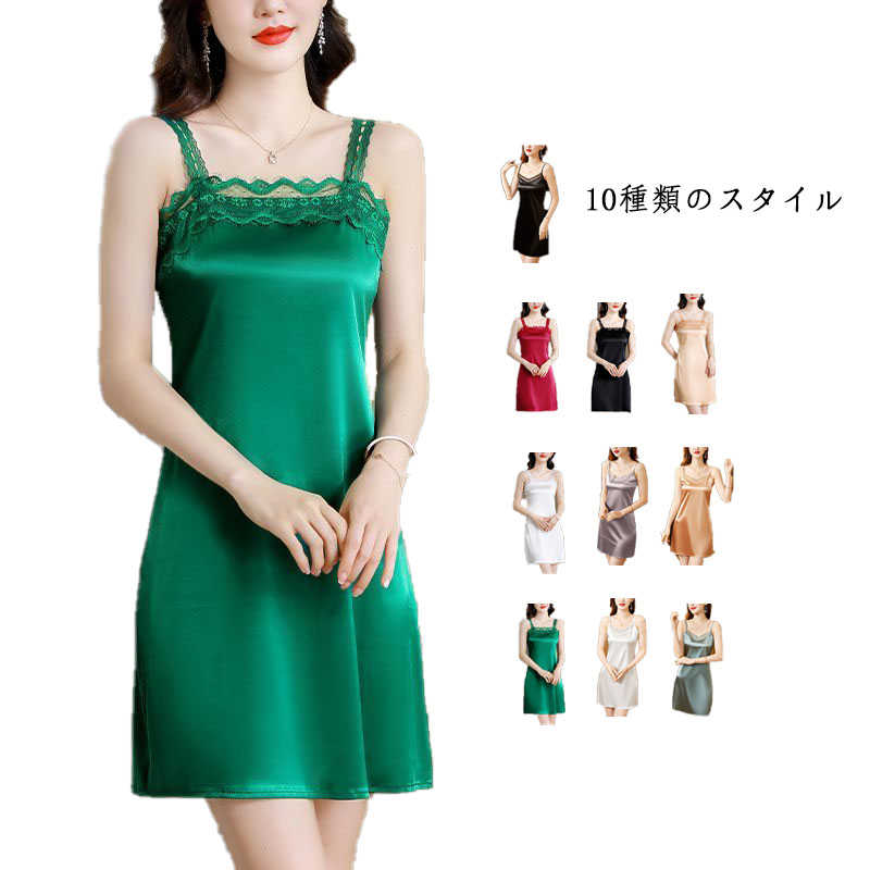 キャミワンピース ロングキャミ サテン キャミソール ロングワンピース レースキャミワンピ 胸元レース ノースリーブ