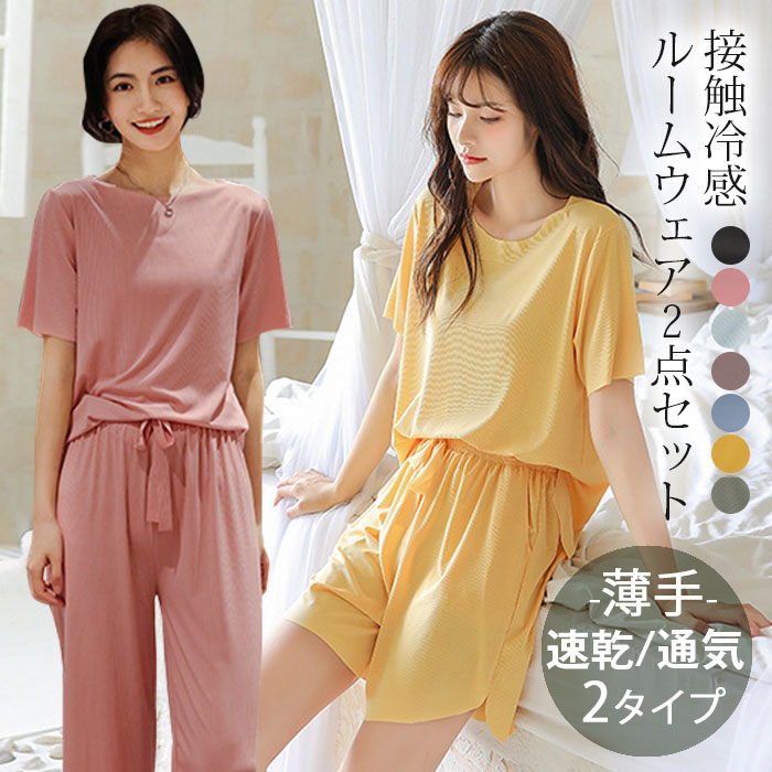 2 サラサラ 冷感 パジャマ レディース 半袖 夏 スリーブシンプルでラフな着こなしにキレイめな印象を与え 着た時にひんやりと感じる素材が素肌にとっても気持ちいい