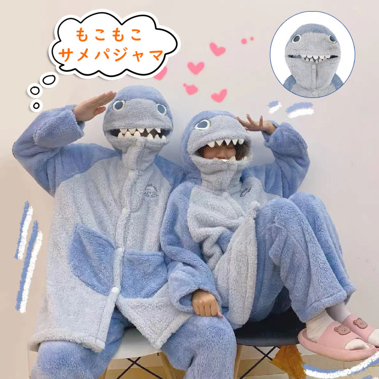 ペアパジャマ サメ 着ぐるみ パジャマ カップル 可愛い もこもこ サメ パジャマ レディース メンズ 長袖 冬用 ルームウェア 暖かい 結婚祝い ギフト プレゼント 友達 おしゃれ