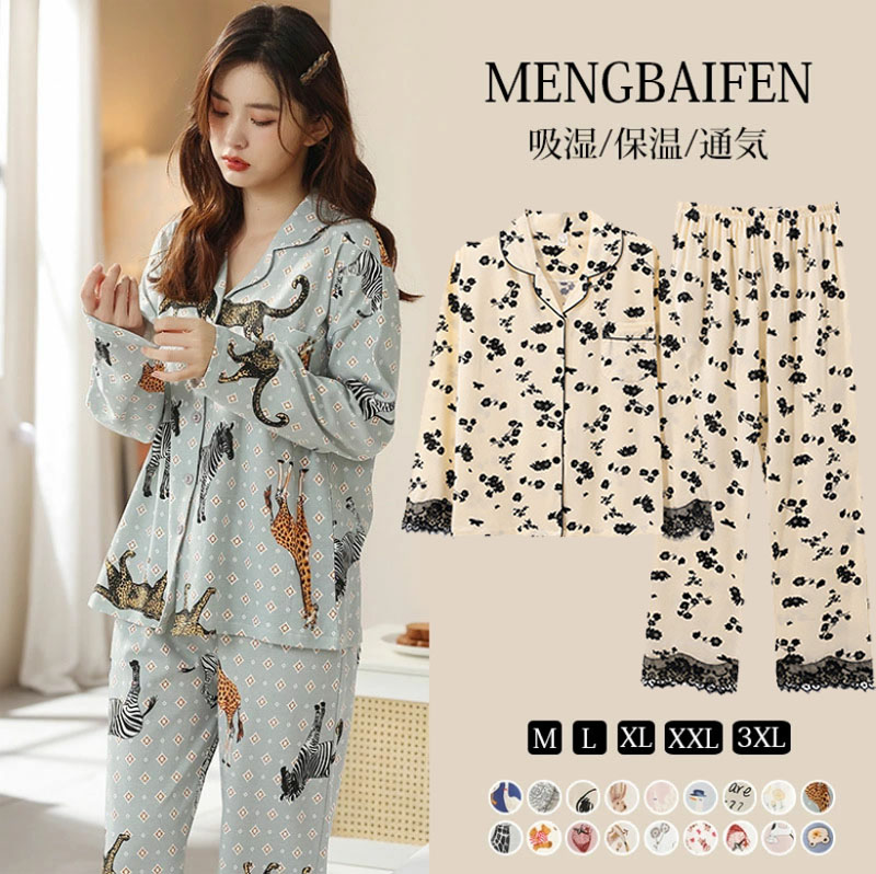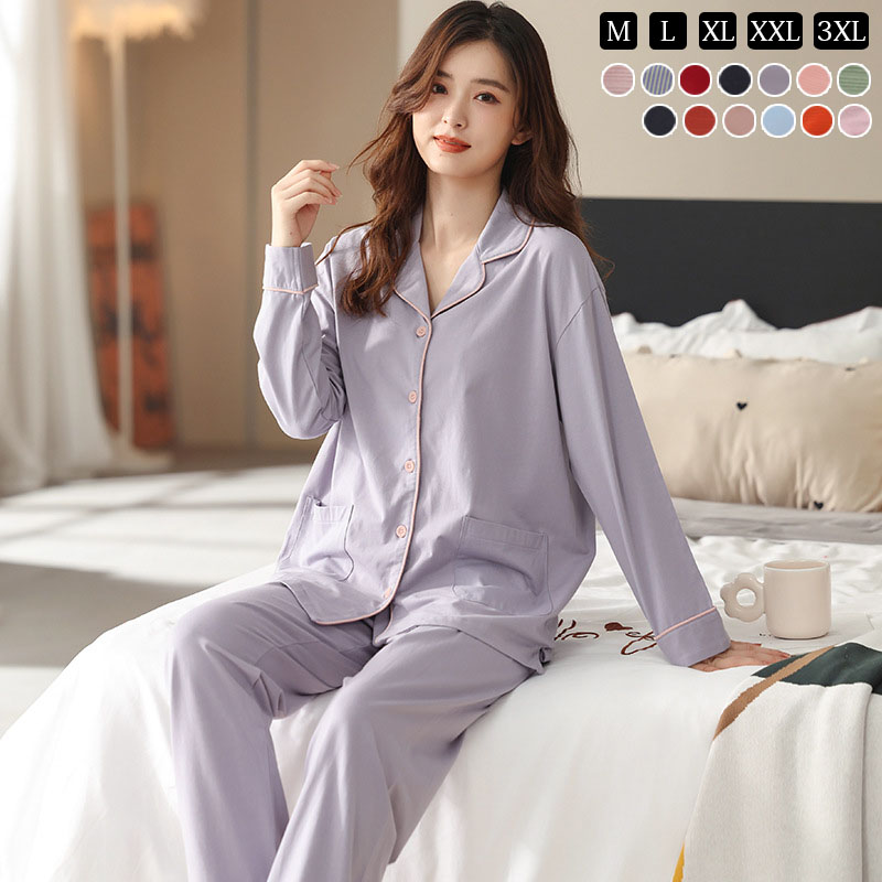 ルームウエア パジャマ レディース 綿 コットン 長袖 長ズボン 春 夏 秋 上下セット 部屋着 寝間着 通気性 前開き 冷え性対策 柔らかい 暖かい 肌触りがいい 18color