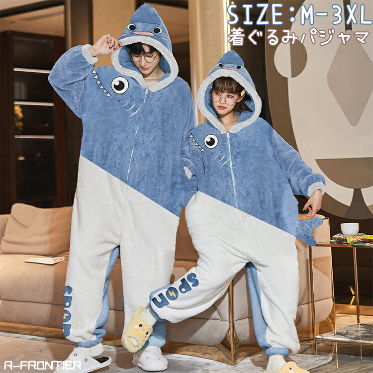 着ぐるみ パジャマ サメ 大人用 ペア パジャマ モコモコ 着ぐるみ パジャマ 可愛い ルームウェア 冬用 レディース メンズ 長袖 動物 前開き 着る毛布 韓国 部屋着 お揃い 夫婦 記念日