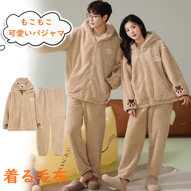 カップル ペアパジャマ 着ぐるみ パジャマ もこもこ クマ耳 可愛い パジャマ レディース メンズ 冬用 長袖 ルームウェア 暖かい 上下セット 結婚祝い ギフト プレゼント 友達 おしゃれ