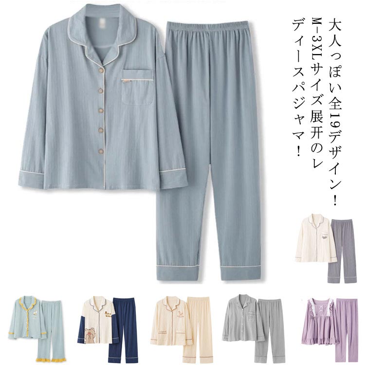 パジャマ ルームウエア レディース 上下セット 寝巻き ナイトウエア 前開き ペア カップル 大きサイズ 長袖 部屋着 綿 トップス コットン ロングパンツ