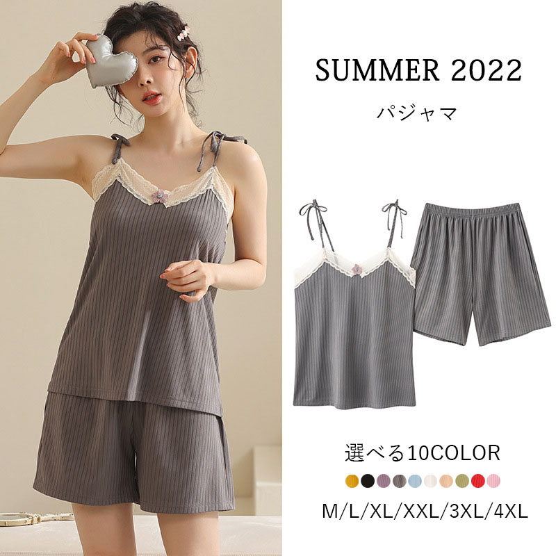 ルームウェア レディース 上下セット パジャマ楽盛りキャミソール リブレースキャミソール&ショートパンツセット パジャマ セットアップ ブラトップ キャミソール 部屋着 綿混 シンプル リブ 無地 可