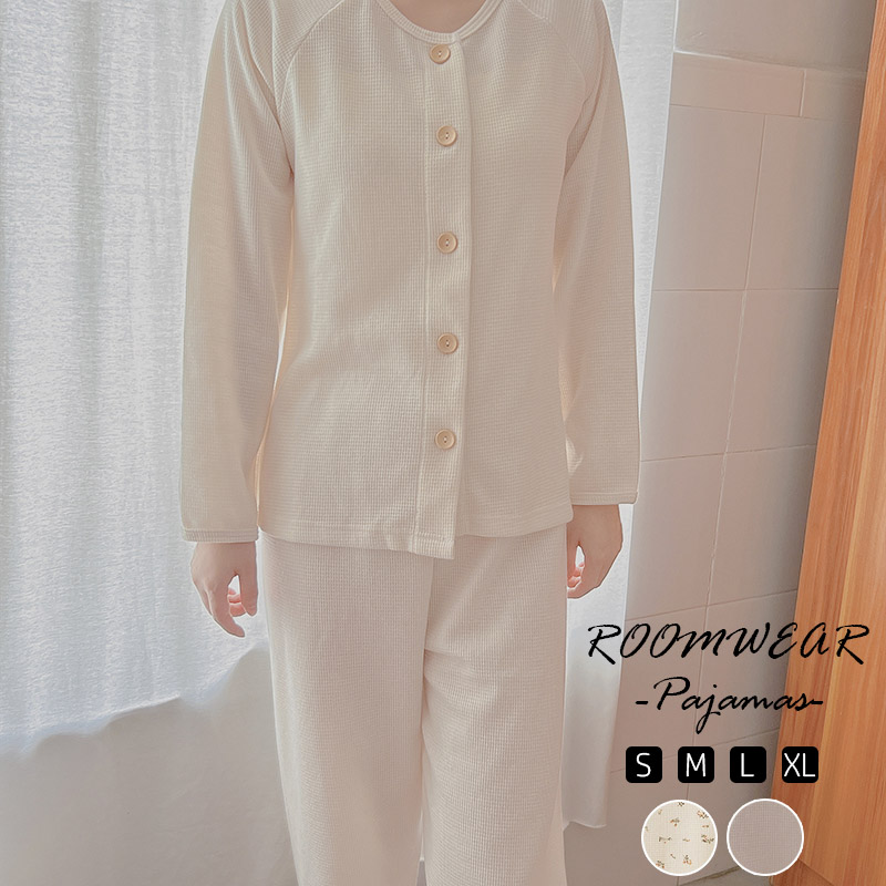ルームウェア レディース パジャマ 寝巻 長袖 長ズボン2点セット 前開き 大きいサイズ ナイトウェア セットアップ トップス パンツ シンプル ガーリー フェミニン エレガント 総柄 花柄 可愛い