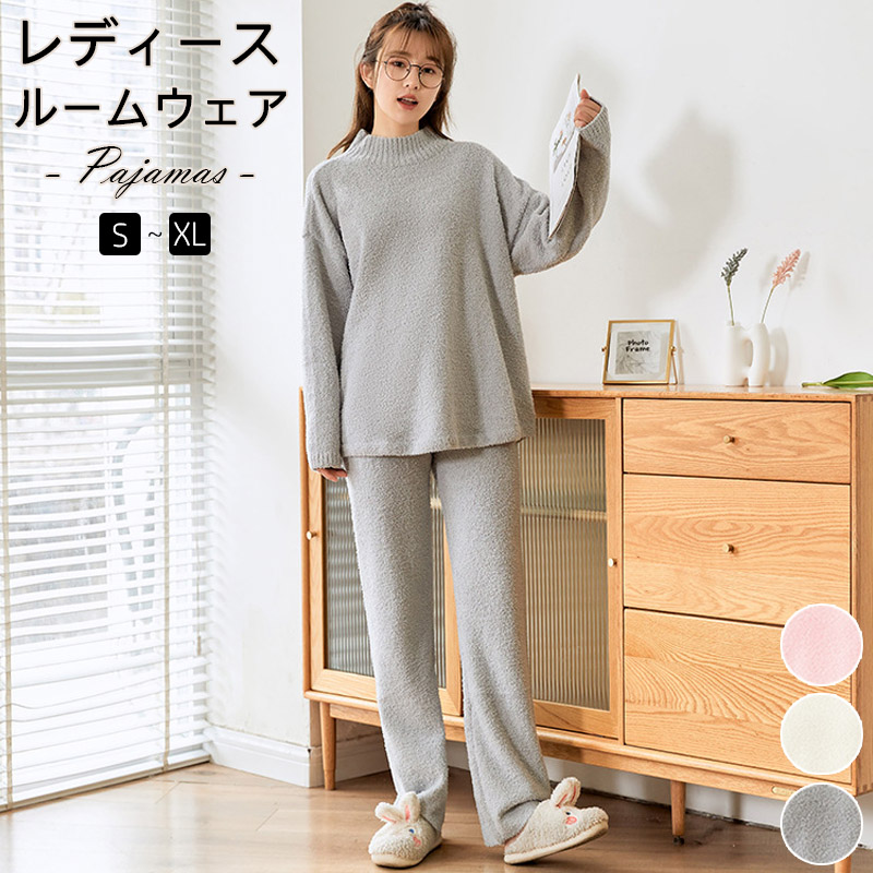 スムーファルームウェアセット ルームウェア セットアップ レディース 秋冬 部屋着 パジャマ ペア 上下セット 長袖ネック 起毛 ベロア調 無地 おしゃれ]選べる~2サイズ展開