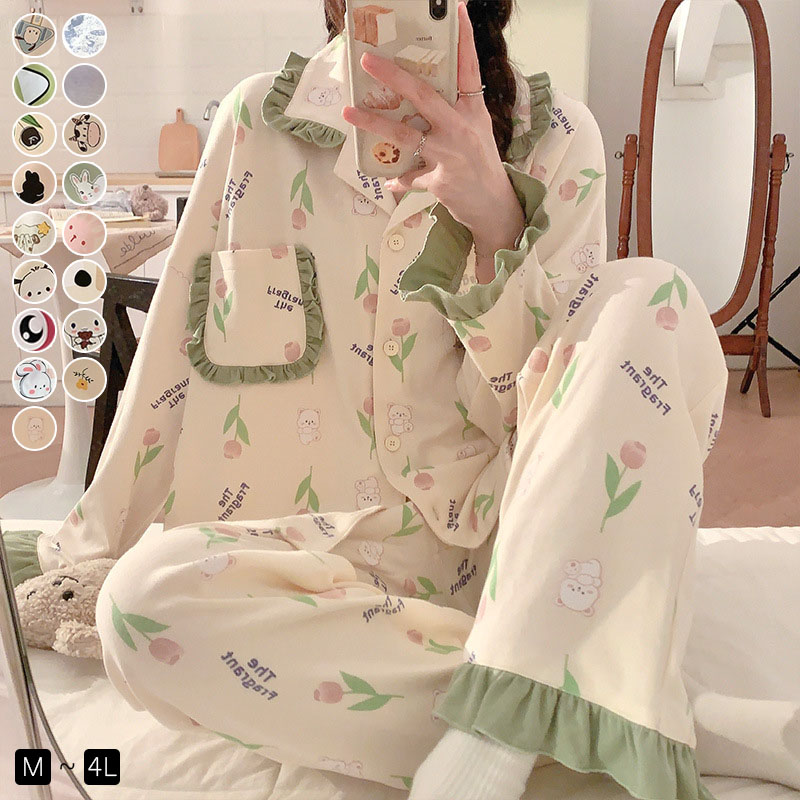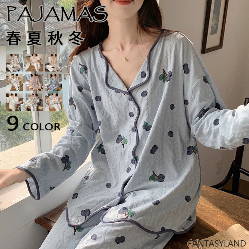 ルームウエア パジャマ レディース 綿 コットン 長袖 長ズボン 春 夏 秋 上下セット 部屋着 寝間着 通気性 前開き 冷え性対策 柔らかい 暖かい 肌触りがいい 8color