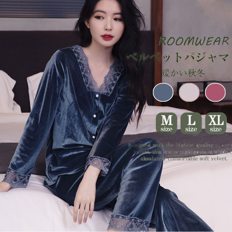 スムーファルームウェアセット ルームウェア セットアップ レディース 秋冬 部屋着 パジャマ ペア 上下セット 長袖vネック 起毛 ベロア調 無地 おしゃれ]選べるM~2Lサイズ展開