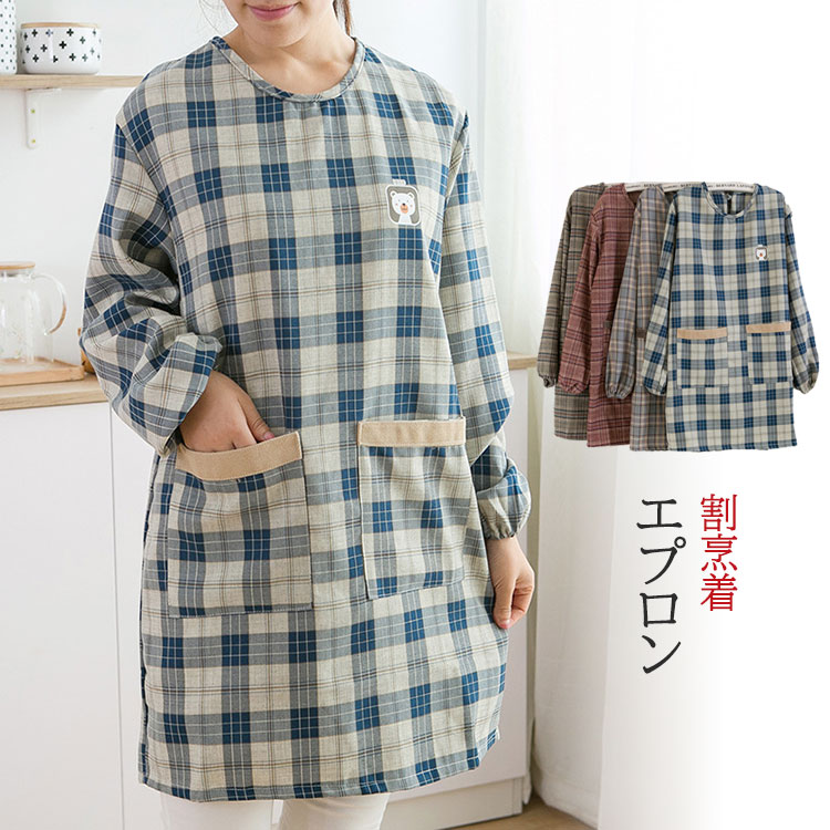 レディース 割烹着エプロン 長袖 エプロン チェック柄 4色 おしゃれ 紐付き ポケット付き 裏防水生地が付く かわいい エプロンワンピース 女の子 主婦 女性 着脱簡単 保育士 家事 キッチン 農作