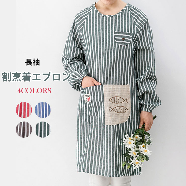 割烹着エプロン 長袖 エプロン レディース ストライプ柄 4色 おしゃれ 紐付き 裏防水生地が付く かわいい エプロンワンピース ポケット付き 女の子 主婦 女性 着脱簡単 保育士 家事 キッチン 農