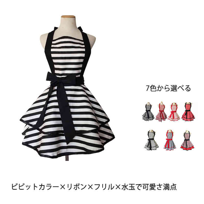 フリルエプロン レディース 7タイプ スカート風 レイヤード ドット 花柄 チェック 菱形 ストライプ かわいい おしゃれ 女性用 レディース