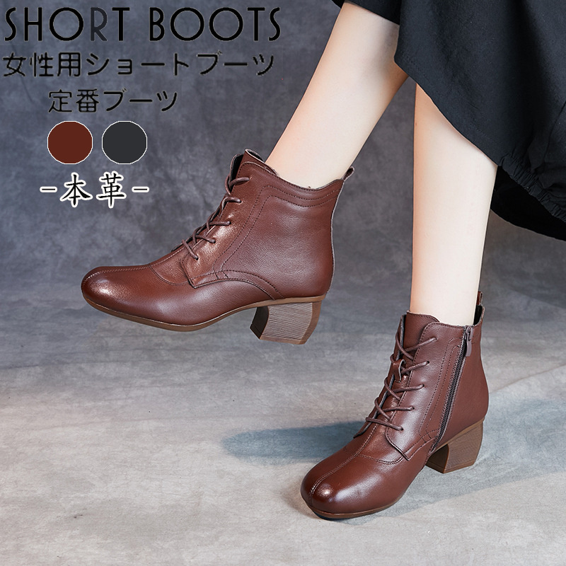 本革 レディース レースアップブーツ 革 ブーツ ショートブーツ 太ヒール 痛くない 歩きやすい サイドジップ チャンキーヒール ラウンドトゥ レースアップ ファスナー秋冬