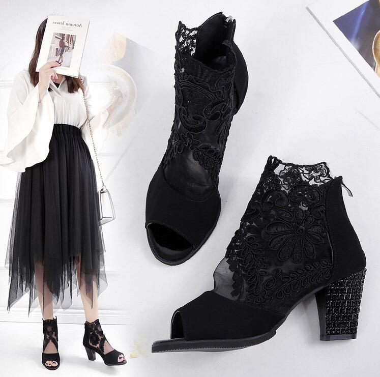 サマーブーツブーツサンダルブーティー花柄刺繍ミドルヒールサンダル太ヒール夏シースルー6センチヒール透かしレディース靴後ろファスナー付き26.5センチまで