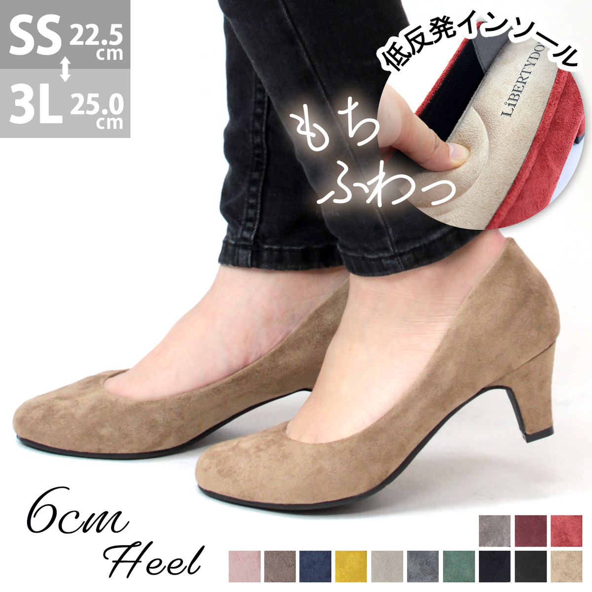 パンプス低反発 インソール 6センチヒール やわらかい かかと クッション スウェード 太めヒール 小さいサイズ セレモニー スーツ 青