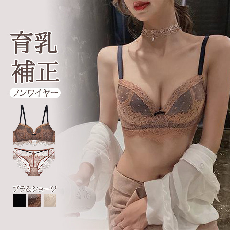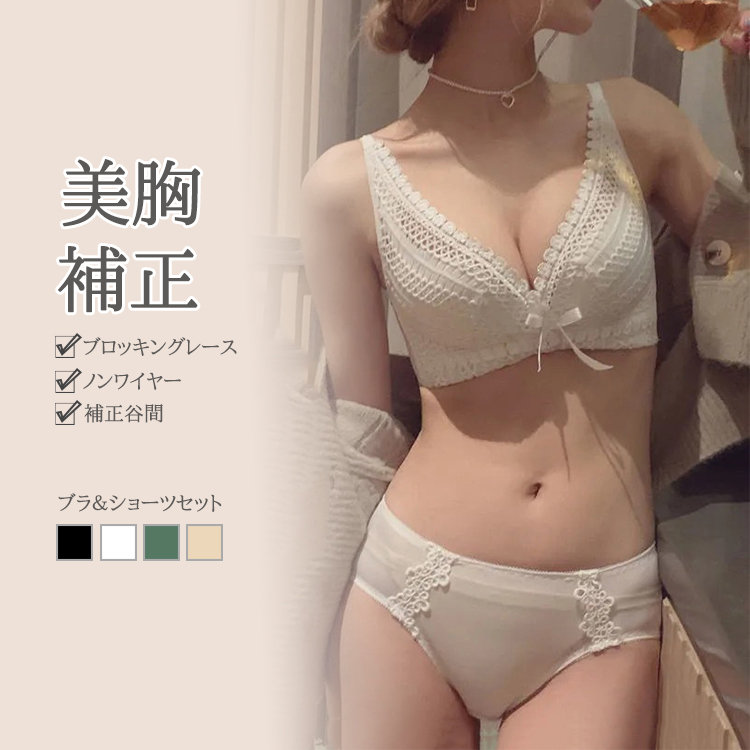 ブラ&ショーツ ノンワイヤー レース ブラジャー ショーツ 谷間 レディース セクシー 美胸 美背 バストアップ 脇高 盛れる 育乳 補正 ブラショーツ ランジェリー インナー