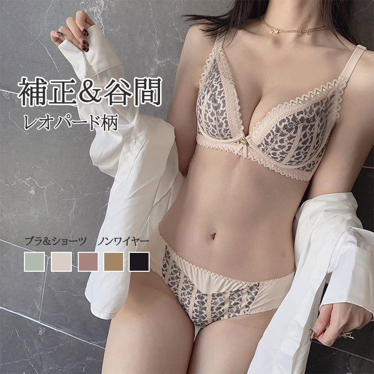 ブラ&ショーツ レオパード柄 バストアップ 補正 ブラジャー ショーツ ブラショーツ ランジェリー インナー ノンワイヤー 美胸 美背 脇高 豹紋 谷間 盛れる レディース セクシー育乳